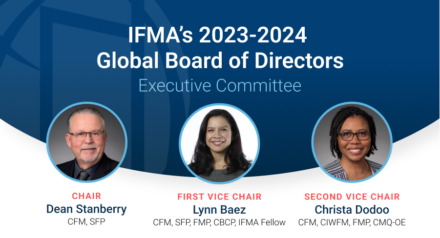 IFMA Announces 2023-24 Global Board of Directors Jun 30, 2023 Bolstered by Financial Stability, Membership Growth & Expanded Offerings, IFMA’s Board Returns Focus on the Evolution & Advancement of Facility Management IFMA is pleased to announce the member-elected executive committee and appointed members of its global board of directors for the 2023-24 fiscal year. Led by Chair Dean Stanberry, CFM, SFP, who begins his term July 1, the board will concentrate efforts on ensuring facility management professionals worldwide have the resources and support to advance in step with emerging industry and business trends. Stanberry is joined on the executive committee by First Vice Chair Lynn Baez, CFM, SFP, FMP, CBCP, IFMA Fellow, and Second Vice Chair Christa Dodoo, CFM, CIWFM, FMP, CMQ-OE. Laurie A. Gilmer, P.E., CFM, FMP, SFP, LEED AP will remain involved as past chair. “Facility management’s significance has soared beyond the mere upkeep of physical spaces,” said Stanberry. “The pandemic underscored the critical need for adaptive, safe and efficient environments, pushing FM to the forefront. We’re no longer just custodians of bricks and mortar but facilitators of innovative, agile workspaces that drive productivity and well-being.” IFMA’s global board intends to build on successes achieved over the past year, including exceeding 23,000 members worldwide; releasing 10 research reports, eight of which were first of a kind; adding new, industry-leading training geared toward keeping FM skills proportional to changing demands; and partnering with other well-respected organizations to address built environment issues and opportunities. “IFMA’s board, staff, volunteer leaders and components worldwide have worked tirelessly to keep our professional community informed, engaged and prepared amid radical changes in how, where and under what conditions people work, gather and interact,” said IFMA President and CEO Don Gilpin. “We have expanded our educational and informational offerings, and broadened and strengthened our network, providing our board with a solid foundation from which to grow. Dean Stanberry brings over 20 years of industry knowledge and association leadership to the board, which will keep our momentum going.” Stanberry is an active industry advocate, previously serving as chair of both IFMA’s Government Affairs Committee and the Environmental Stewardship, Utilities and Sustainability Community. He is an Advisory Group 2 committee member and U.S. representative for ISO/TC 267, which has produced multiple documents within the ISO 41000 FM standards series, which focuses on FM as the foremost contributor to a more productive, sustainable and livable built environment. “Integrating smart technology, renewable energy solutions and highly efficient building systems has become vital to our operations. The growing demand for decarbonization means we are central players in the global effort to reduce buildings’ carbon emissions,” Stanberry added. “We have witnessed first-hand how robust facility management can positively transform organizations, enhancing the employee experience, reducing costs, and contributing to broader social and environmental goals. It’s an exciting time to be in this evolving field, and the relevance of our work has never been more pronounced.” IFMA is indebted to outgoing Chair Laurie Gilmer for her leadership. Focusing on the importance of professional connections, she traveled extensively to reestablish relationships with and between members and partners, reignite enthusiasm and participation throughout the association, and remind the IFMA community that fellow members are its greatest source of support and strength. “The driving force for what we do, how and why we do it, is people. Those in our facilities motivate us to do the best job possible. Those in our community inspire us to be the best FMs possible,” said Gilmer. Learn more about IFMA’s global board of directors at ifma.org/about/leadership-staff/board-of-directors/global-board-of-directors/. IFMA 2023-24 Global Board of Directors Executive Committee ChairDean Stanberry, CFM, SFPContractor to the U.S. General Services AdministrationDenver, Colorado, USA First Vice ChairLynn Baez, CFM, SFP, FMP, CBCP, IFMA FellowEnterprise Vice President of Facilities and Workplace, McKessonIrving, Texas, USA Second Vice ChairChrista Dodoo, CFM, CIWFM, FMP, CMQ-OEHead, Global Facilities Management Services United Nations World Food ProgrammeRome, Italy Ex-OfficioDon GilpinPresident and CEO, IFMATraverse City, Michigan, USA Past ChairLaurie A. Gilmer, P.E., CFM, FMP, SFP, LEED APPresident/COO, Facility Engineering Associates, P.C.Santa Rosa, California, USA Board of Directors Francisco Antonio de Souza Abrantes, MBASenior Consultant, FASA ConsultingSão Paulo, Brazil Trudy Blight, CFM, FMP, SFP, BID, PIDIM, PMP, IFMA FellowProject Manager, AES Services, University of ManitobaWinnipeg, MB, Canada Jason E. Callis, CFMIndianapolis, Indiana, USA Cheryl CarronGlobal Head, Facilities Management & Experience Services Corporate Solutions, JLLMilwaukee, Wisconsin, USA Lorena EspadaEMEA Head of Facility Management, Chubb European GroupMadrid, Spain Aykean Matthews, MBA, CFM, FMPFacilities Director, The International School of Port of SpainPort of Spain, Trinidad & Tobago Arnald NG, CFM, SLCR, MRICSAPAC Delivery & Performance Director, GSKSingapore Lena Thompson, FMP, SFP, IFMA FellowDirector, Building Operations & OFM, American Psychological AssociationWashington, D.C., USA Luis R. ViñaLatAm Alliance Director | CBRE @UBERCiudad de México, Mexico