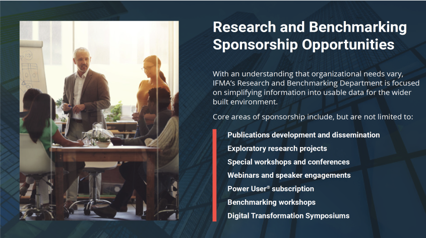 Whether you are a small business or a large corporation, IFMA Research and Benchmarking will work closely with you to understand your business needs and provide tailored insights for critical business decisions so you can stay ahead of the curve.